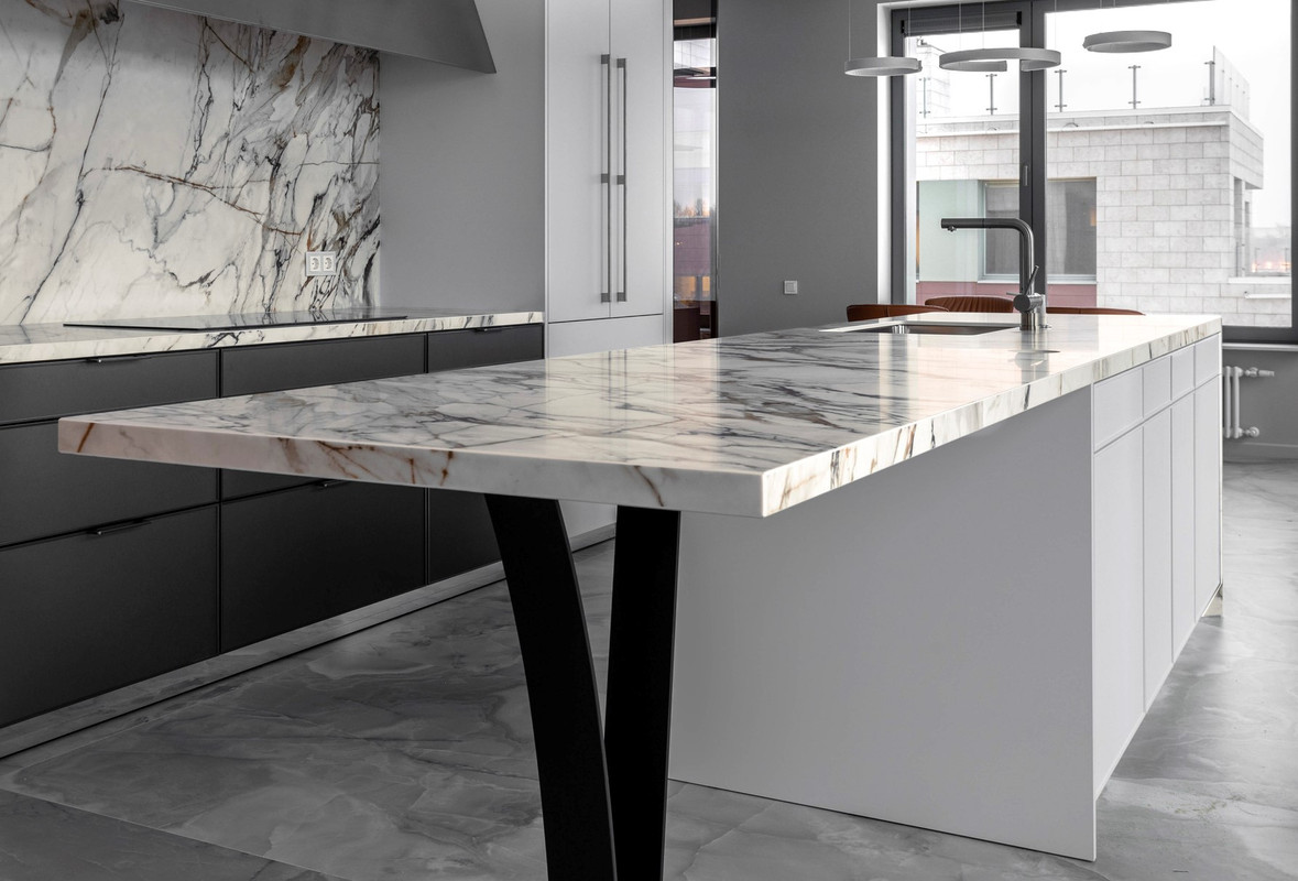 В наше время тренд на изделия из широкоформатной керамики по-прежнему актуален и меняются лишь цветовые предпочтения. Сейчас модные тенденции за бежевым полупрозрачным мрамором, мрамором светлым с контрастным ярким рисунком, деревом любого узора и оттенка и натуральными камнями как оникс, кварцит, травертин и др.